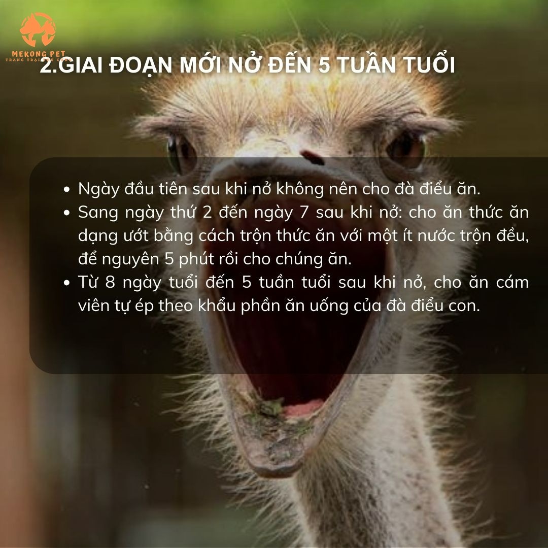 Giai đoạn mới nở là giai đoạn nhạy cảm, hay xãy ra rủi ro nhất đối với đà điểu con mới nở cho tới lứa tuổi đà điểu con 1 tháng tuổi. Cần cho ăn kĩ và tiêm phòng vaxin đầy đủ đảm bảo đề kháng tốt.